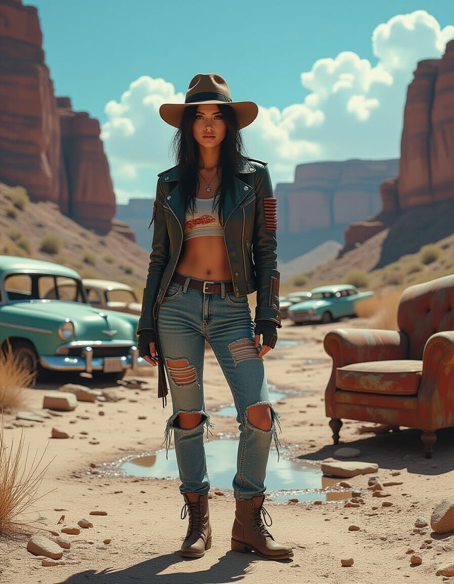 This image shows a woman in ragged cyberpunk attire standing in a desolate riverbed littered with debris. The scene is rendered in a hyperrealistic digital art style with high contrast.
