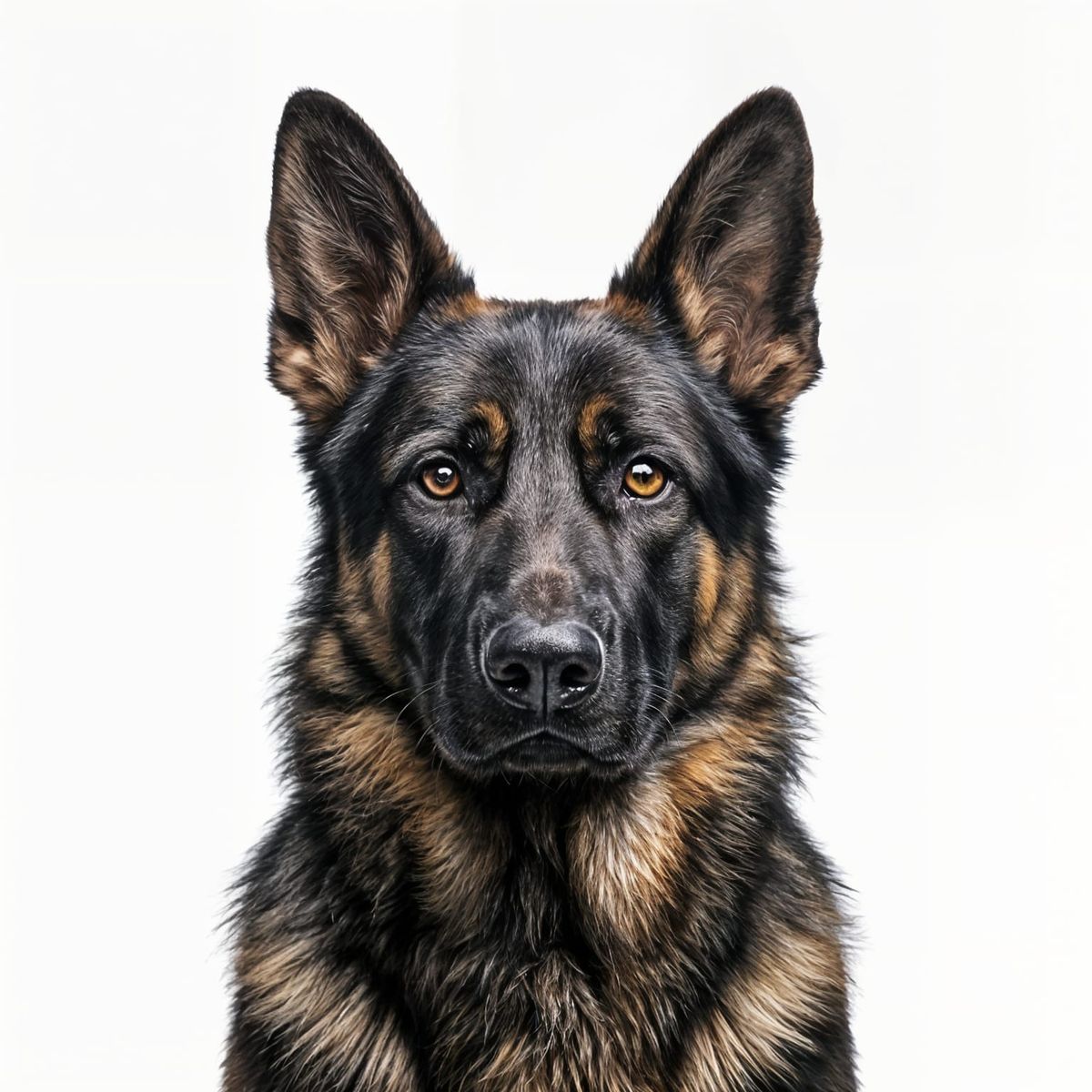 This image shows a close-up, realistic portrait of a dark sable German Shepherd against a clean white background. The focus is on the dog's face and expressive features.