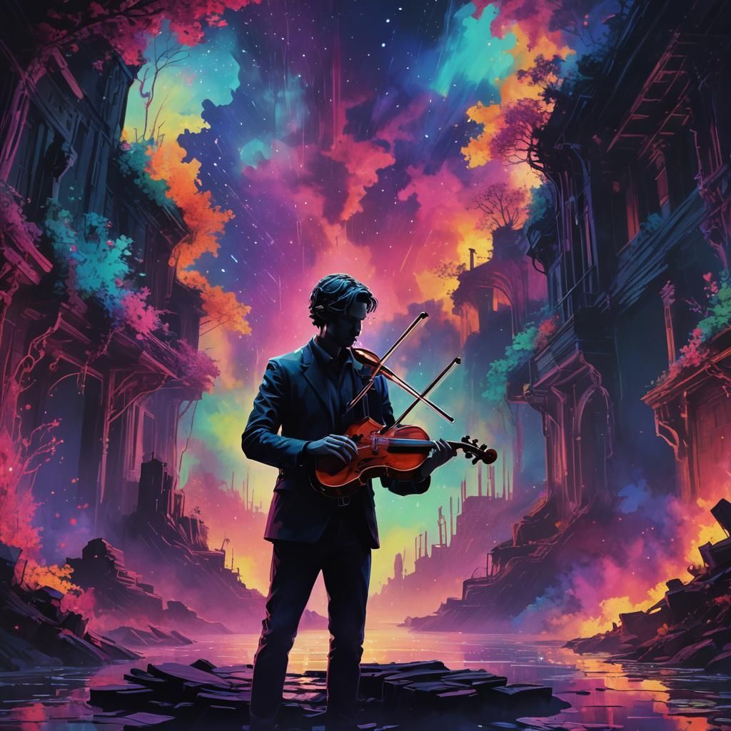 A futuristic silhouette plays the violin amidst a cosmic landscape. The image features dynamic lighting, deep colors, and a blend of geometric and fractal elements, rendered as digital art.