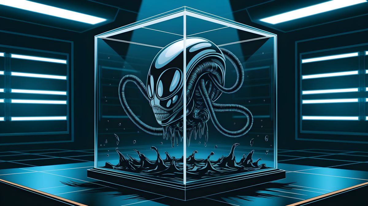 This striking illustration depicts a futuristic alien machine in a dimly lit science lab, with intricate metallic tendrils and pulsating black slime, set against a vibrant triadic color palette.