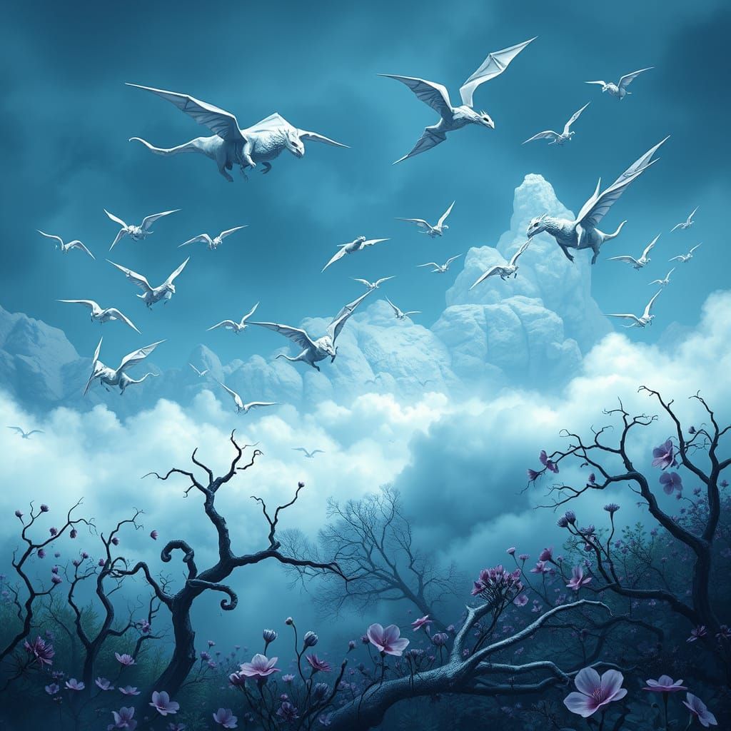 A surreal scene of origami dragons flying above a garden with blue and purple flora. This digital artwork uses geometric patterns and cubist techniques to create a spooky atmosphere.