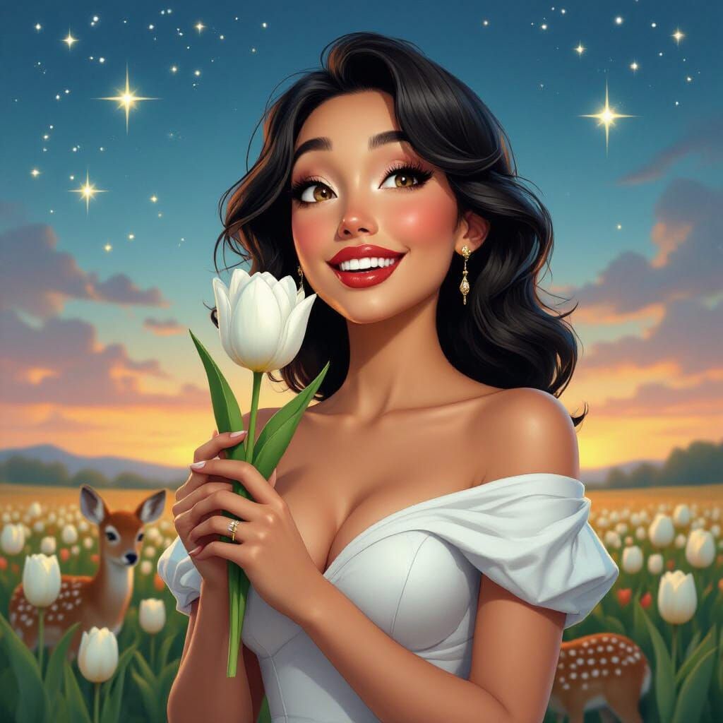 A striking picture of a laughing woman with hazel eyes holding a tulip at dawn. The image features falling stars, a tulip field, and a gentle fawn in a hyperrealistic style with deep colors.
