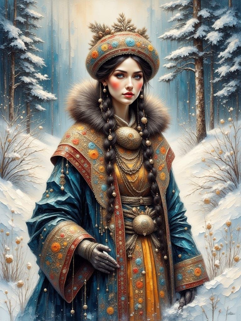 A portrait of a Siberian woman in traditional dress standing in a snowy landscape. The image features impasto paint textures and soft brushstrokes, creating a serene and ethereal atmosphere.