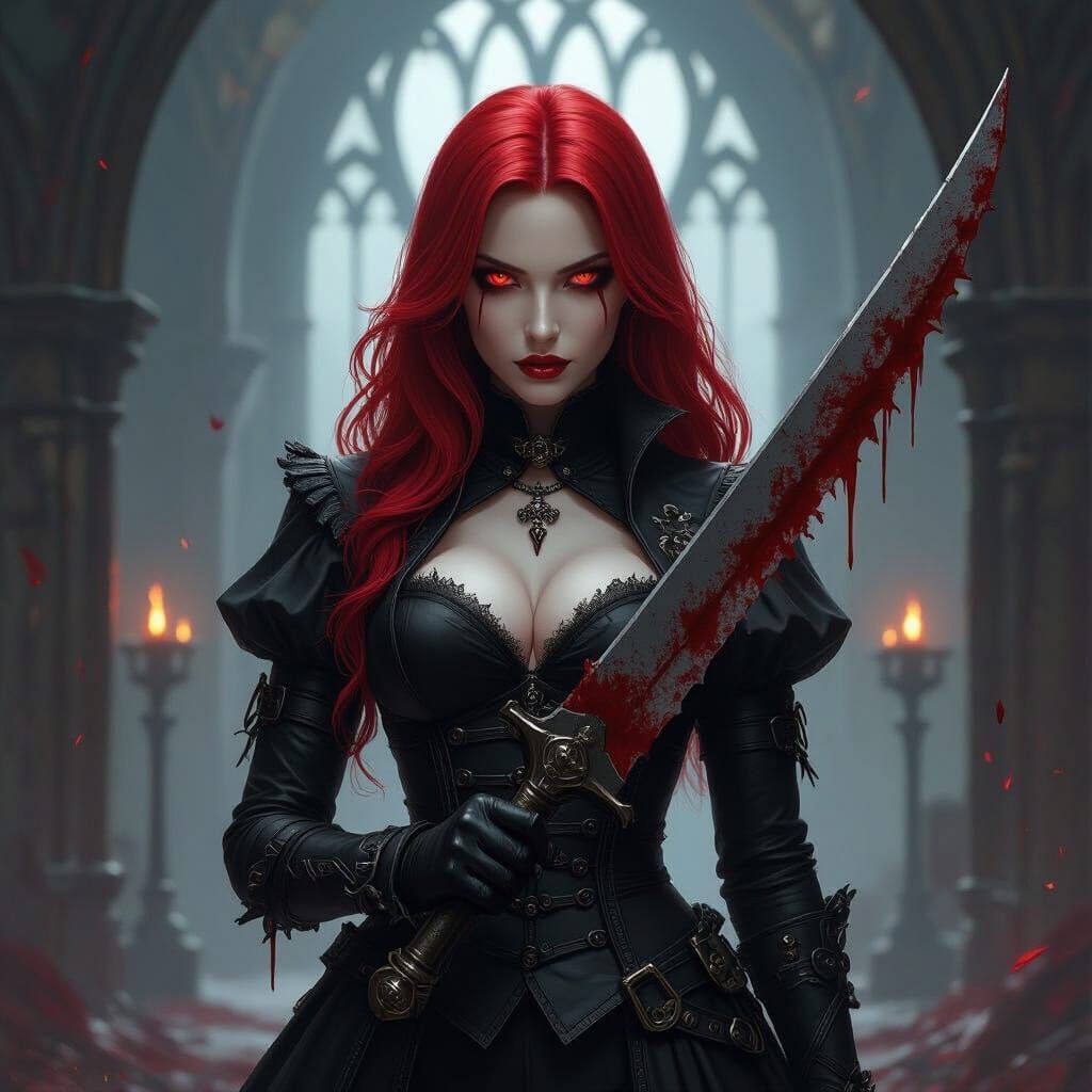 This image depicts a formidable female hunter with blood-red hair and eyes, holding a serrated saw cleaver in a dark gothic setting. The art style emphasizes grim detail and dramatic lighting.