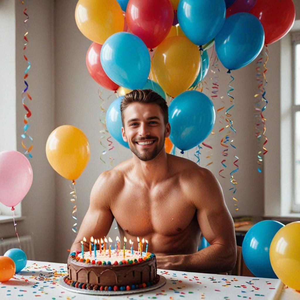 This image shows a lively gay birthday party with a group of handsome men celebrating in a festive setting. The birthday boy sits at a table with a colourful cake, surrounded by his friends, all smiling and laughing.