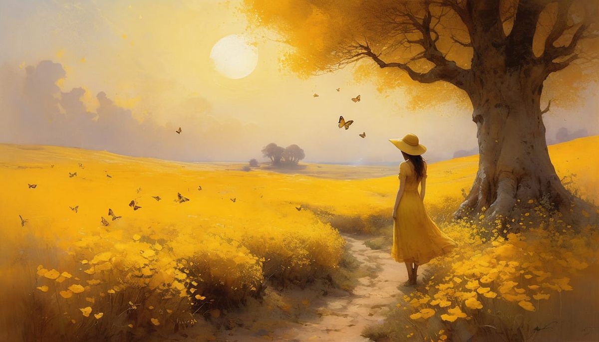 This watercolor painting captures a serene scene of a girl in a yellow dress and sun hat amidst a field of golden flowers. Delicate butterflies flutter around her as a large tree with vibrant yellow foliage provides a magical backdrop. The artwork features soft, glowing blooms and a warm color palette, e...