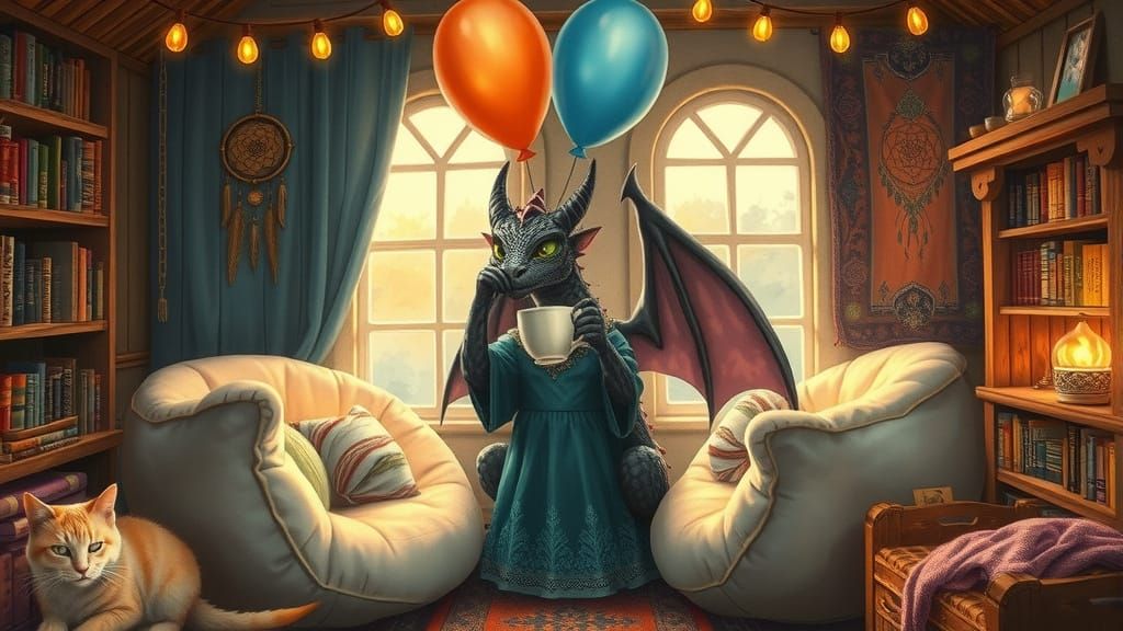 A gothic-hippie dragon Balloons sipping tea in a cozy cottage filled with plush beanbag chairs and twinkling fairy lights, while a little ki...