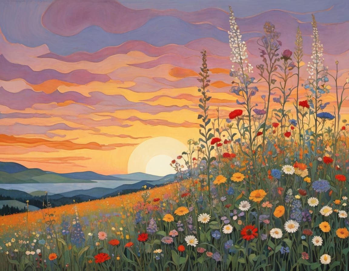 A vibrant, abstract field of wildflowers at sunset. This digital artwork captures the scene with fine details and complementary colors, reminiscent of early 20th-century Art Nouveau.