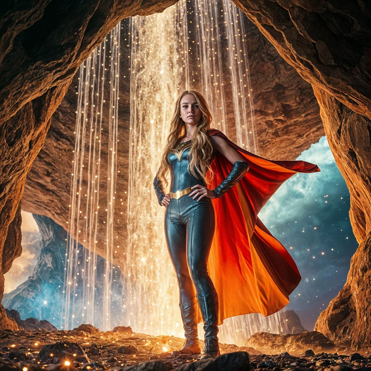 This image shows a blonde superheroine standing strong amid cosmic chaos. She stands in a geode filled with stardust, with nebulae and galaxies in the background. It has a cinematic, film-like quality.