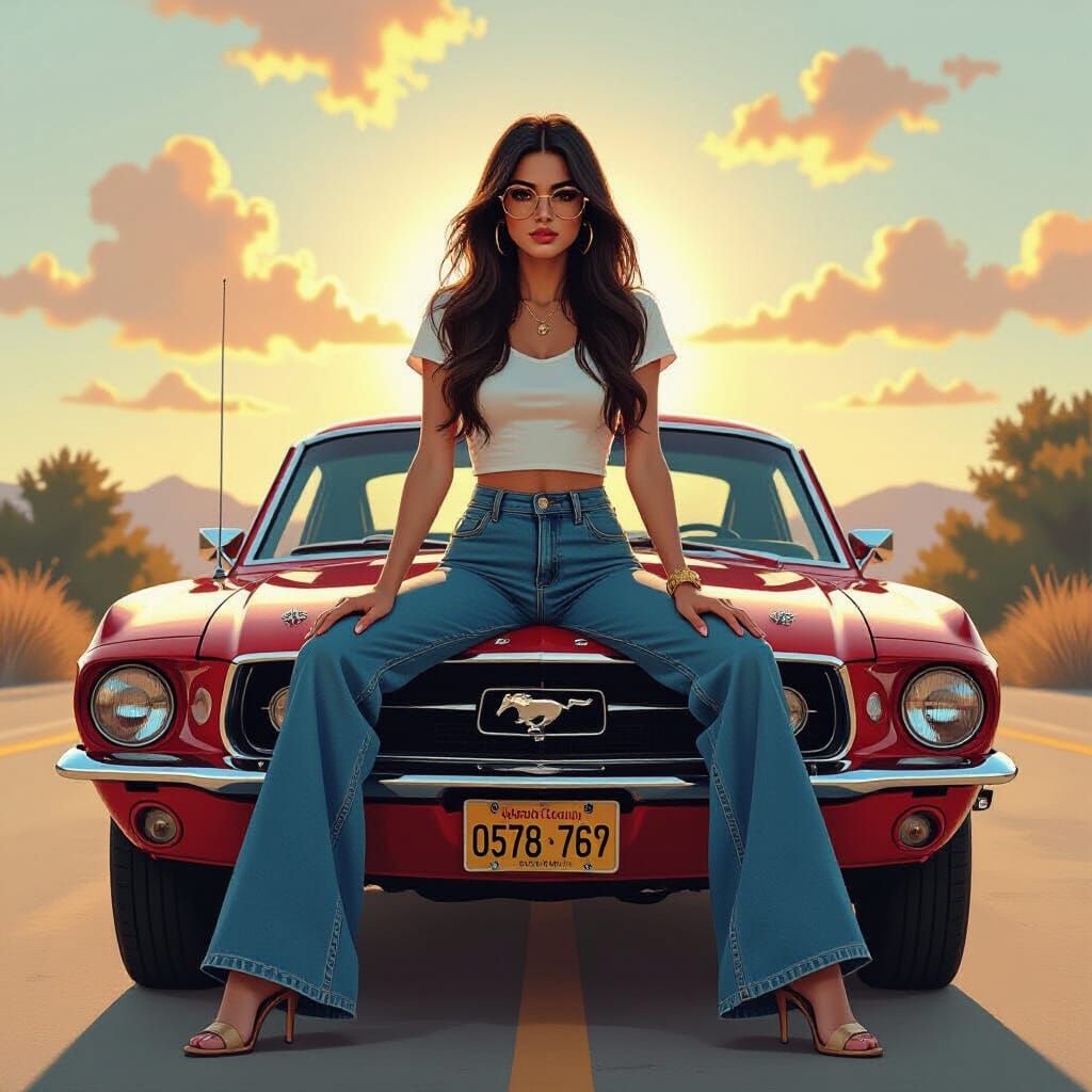 This image shows a woman with long dark hair and 70s attire on a vintage cherry red Mustang. The scene features late afternoon sun, long shadows, and a vibrant, retro aesthetic with cinematic lighting.