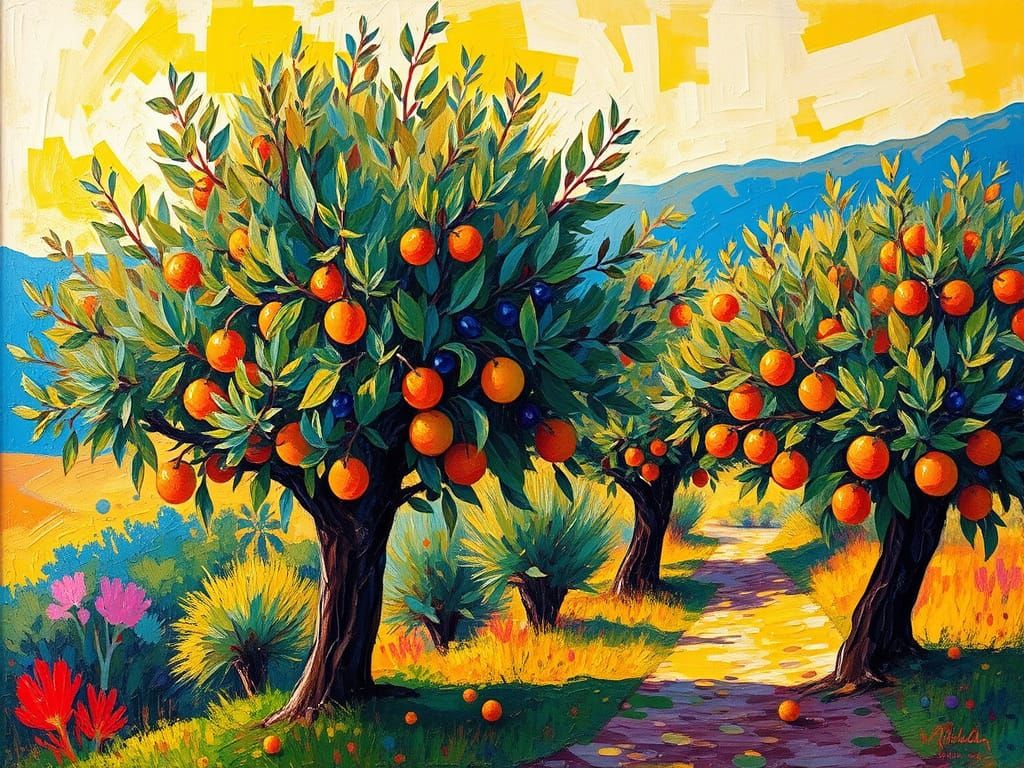 This image shows an abstract impressionist painting of a Sicilian afternoon with olive and orange trees, featuring bold brushstrokes and vibrant neon colors.