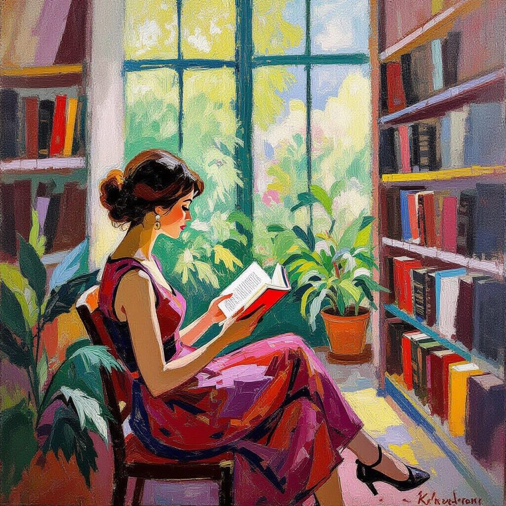 This image shows a woman reading in a vibrant library setting. The artwork is in a fauvist style, using wild brushstrokes and clashing colors to create a bold and expressive scene.