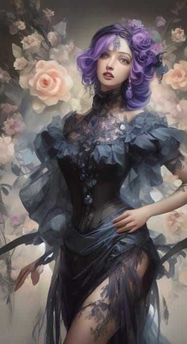 A concept art digital illustration of a Goth woman with intricate blackwork floral tattoos wrapping her limbs. Features a moody, jewel-toned background and dramatic lighting.