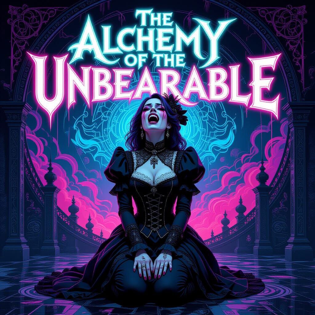 This image shows a crying Victorian witch kneeling amidst swirling pink, purple, and cyan colors. Above her, bold neon cyberpunk text spells out "The Alchemy of the Unbearable" in an art deco style.