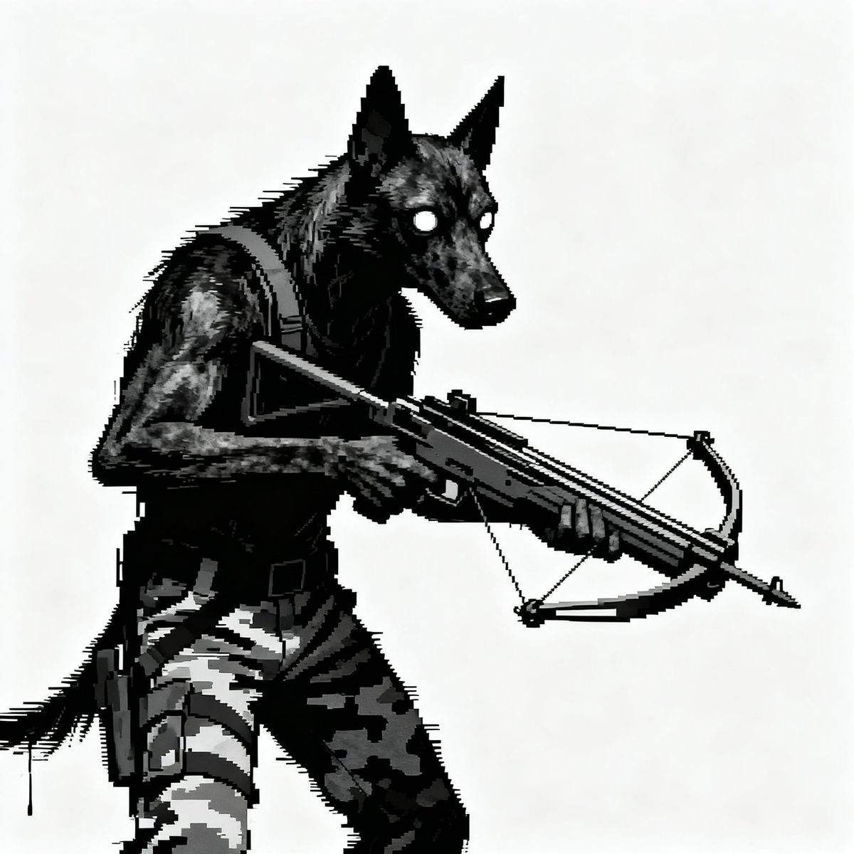 This image features a chilling death hound in a stark, minimalist horror scene. It wears camo pants and wields a crossbow, with glitch effects adding to the unsettling atmosphere.