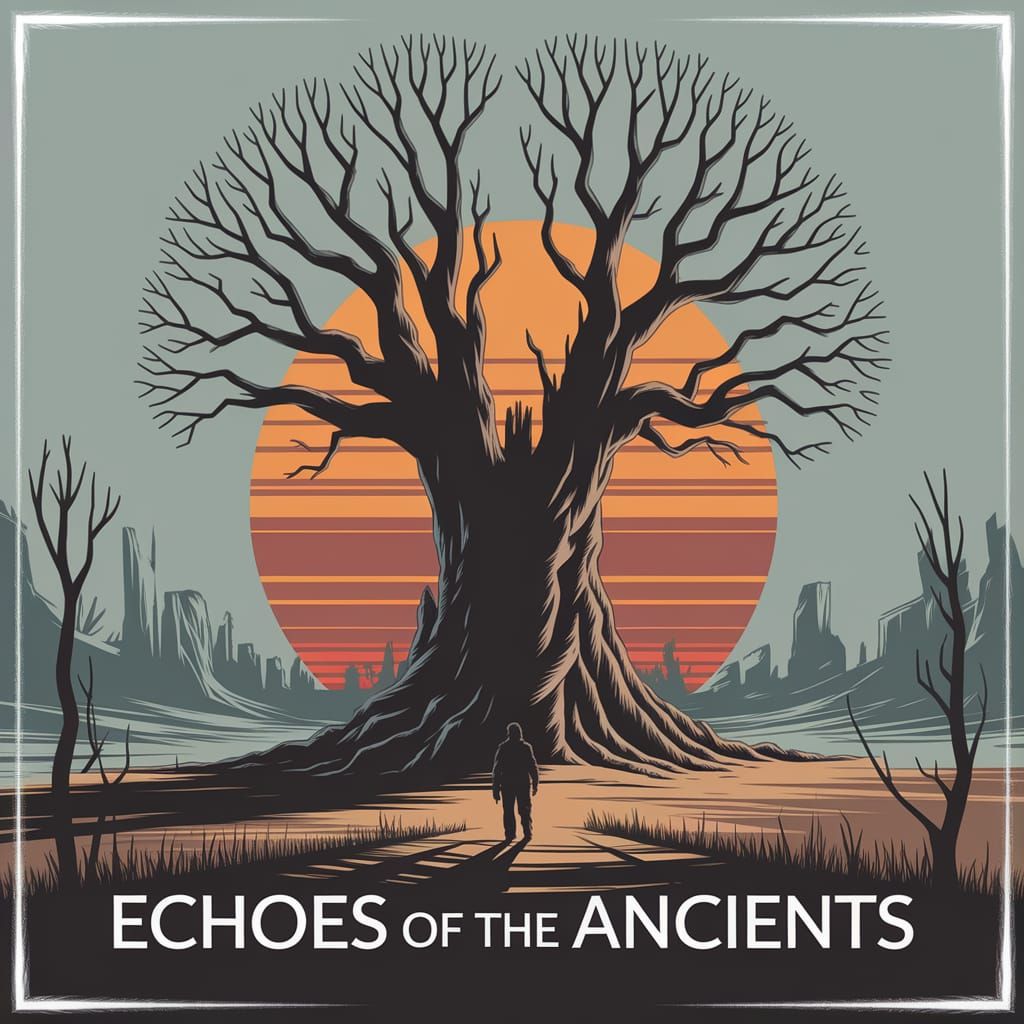 This image shows a lone wanderer silhouetted against a colossal, ancient tree in a desolate, post-apocalyptic wasteland. The scene is rendered with a gritty, realistic aesthetic.
