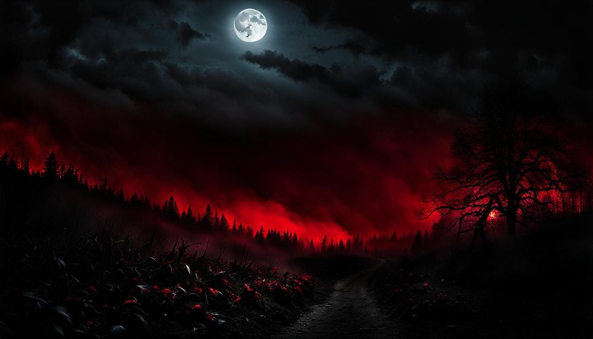 A terrifying landscape inspired by classic horror themes. The image showcases dark fantasy elements with intricate details, dynamic lighting, and a cinematic feel, rendered as a 3D masterpiece.