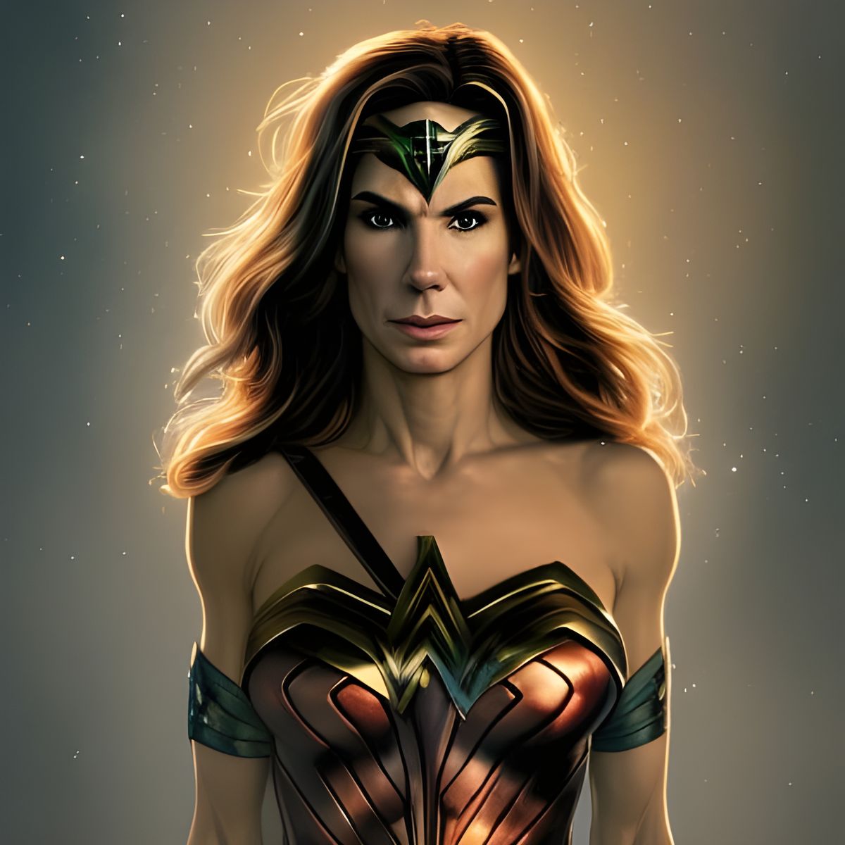 This image shows a hyperdetailed portrait of Wonder Woman. Dynamic lighting and intricate details are rendered in a splash art style with triadic colors.