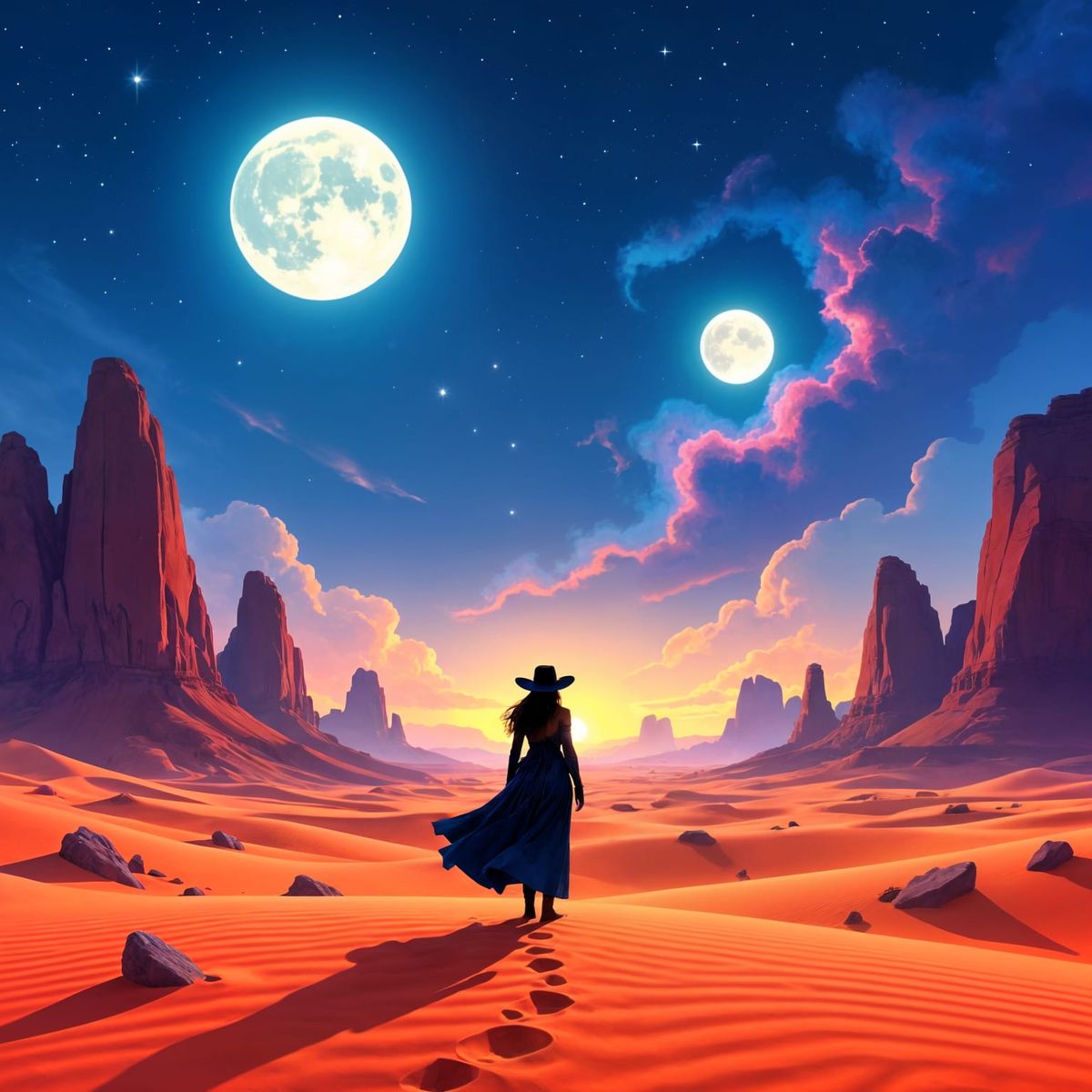 This image shows a solitary cowgirl in a glowing alien desert with two moons and nebulae. It features detailed illustration and painterly textures, evoking wonder and solitude.