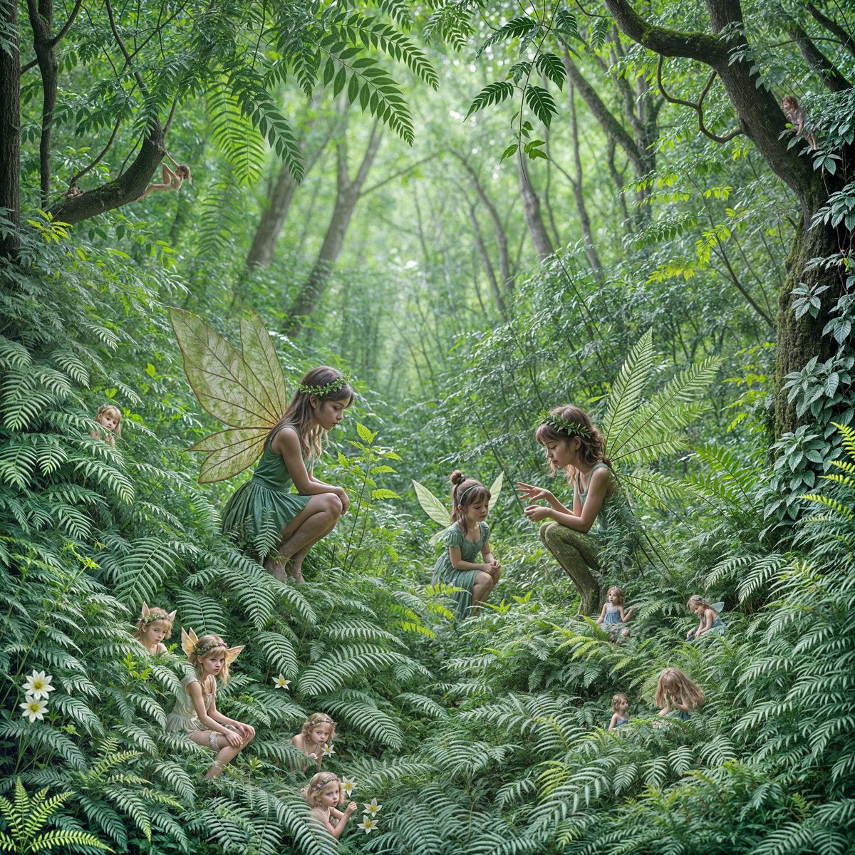 This image displays tiny, camouflaged fairies subtly integrated among lush leaves and ferns within a magical forest setting.