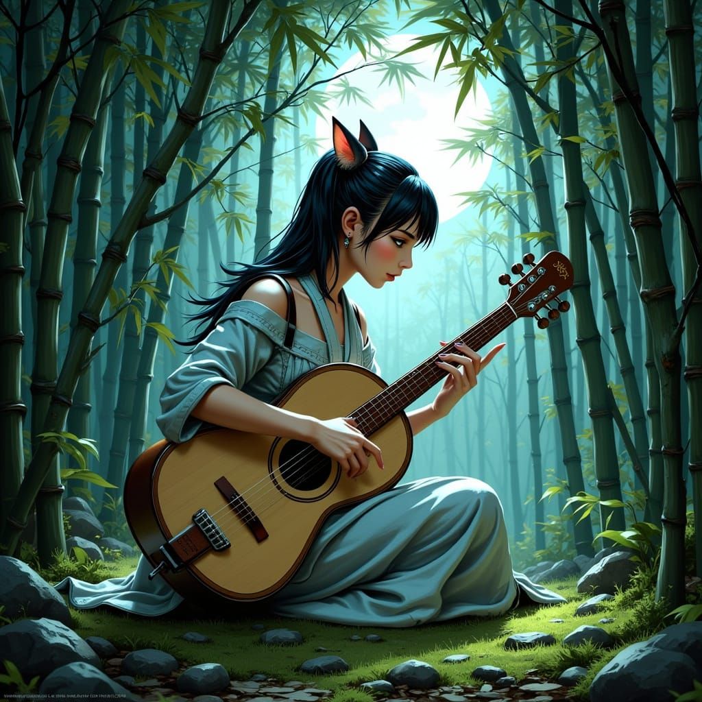 This image shows a beastkin girl with feline eyes playing a shamisen in a tranquil bamboo forest. The artwork combines Japanese woodblock print and fantasy illustration styles, emphasizing natural textures and a peaceful mood.