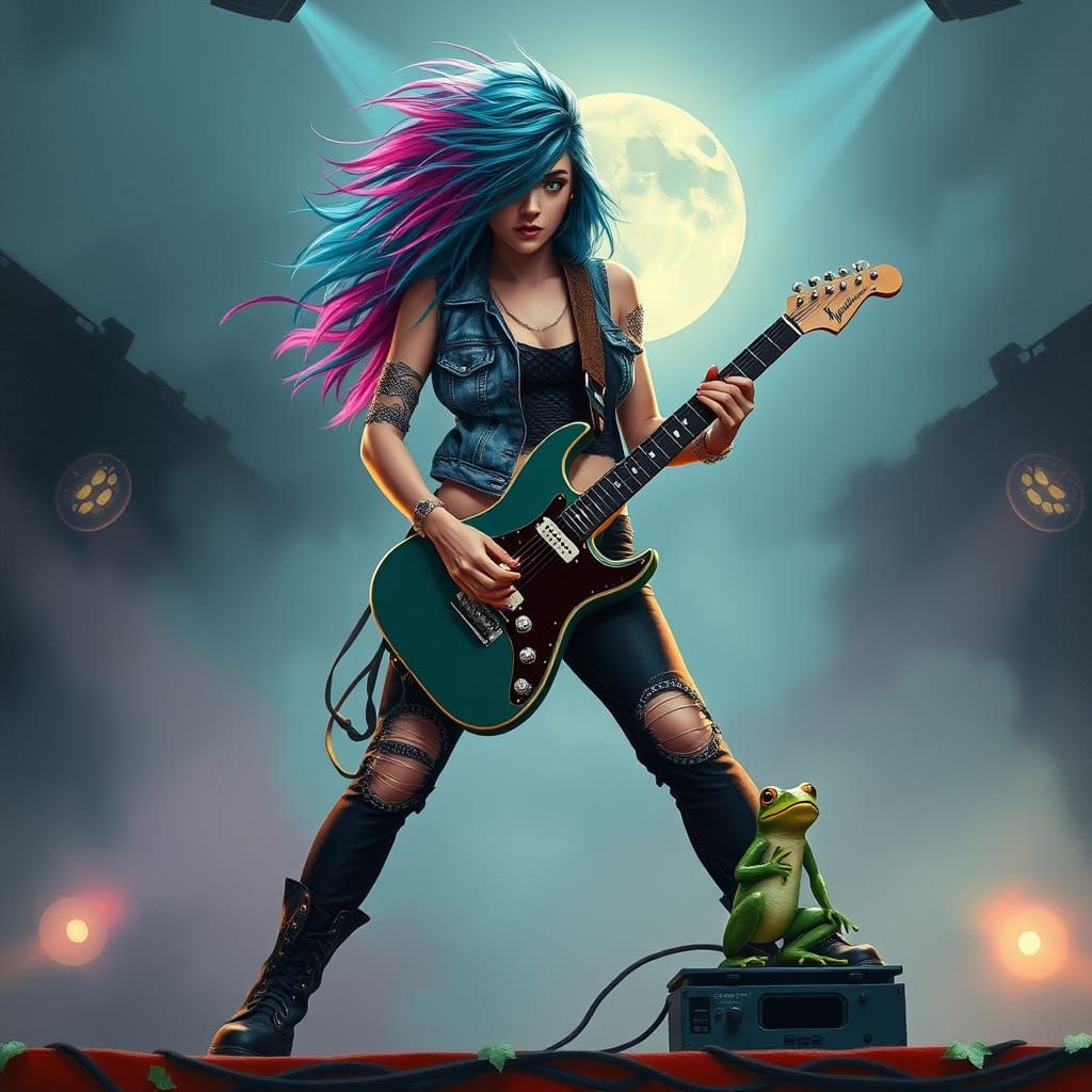 A vibrant image of a punk rocker girl playing guitar on stage in a dreamy painterly style. Soft lighting and expressive brushwork capture the energy of the performance under a misty moon.