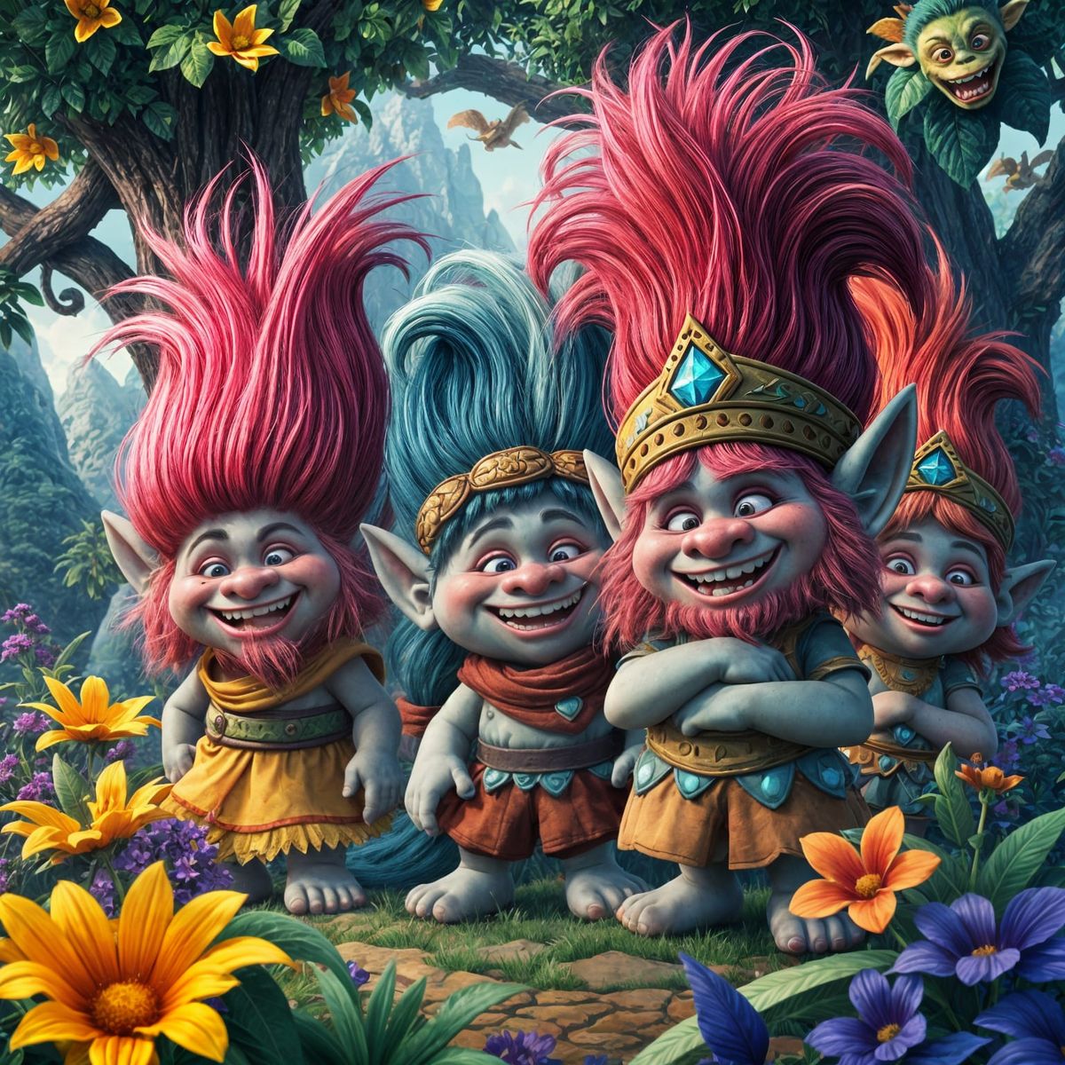 This image shows a vibrant portrait of trolls exuding joy. The artwork boasts intricate details, deep colors, and a fantastical aesthetic, reminiscent of trending fantasy concept art.