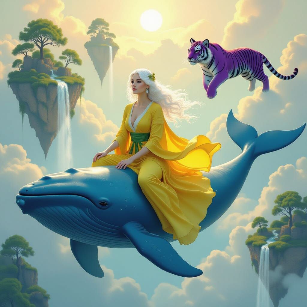 Най отпред красива ефирна жена с бяла коса, красиво и нежно лице и светли очи, да бъде в жълта затворена роба със зелен колан. Да е качена на син кит който плува във въздуха. До нея да лети лилав тигър. Фона да е въздушен и да има летящи острови с дървета от който да падат водопади.