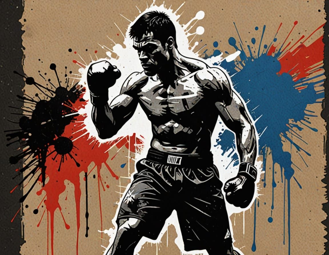 This image depicts a gritty, unfinished sketch of a boxer in a fighting stance, set against a background of chaotic Russian flag colors paint drips with thick brush strokes and textured paper, evoking the spirit of revolutionary poster art and Soviet protest graffiti.