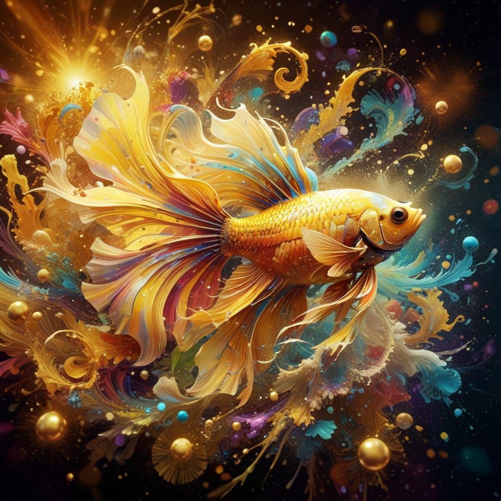 This vibrant digital painting showcases a close-up of a yellow siamese fish amidst a kaleidoscope of colors and swirling patterns, with intricate details and a mix of warm and cool tones.