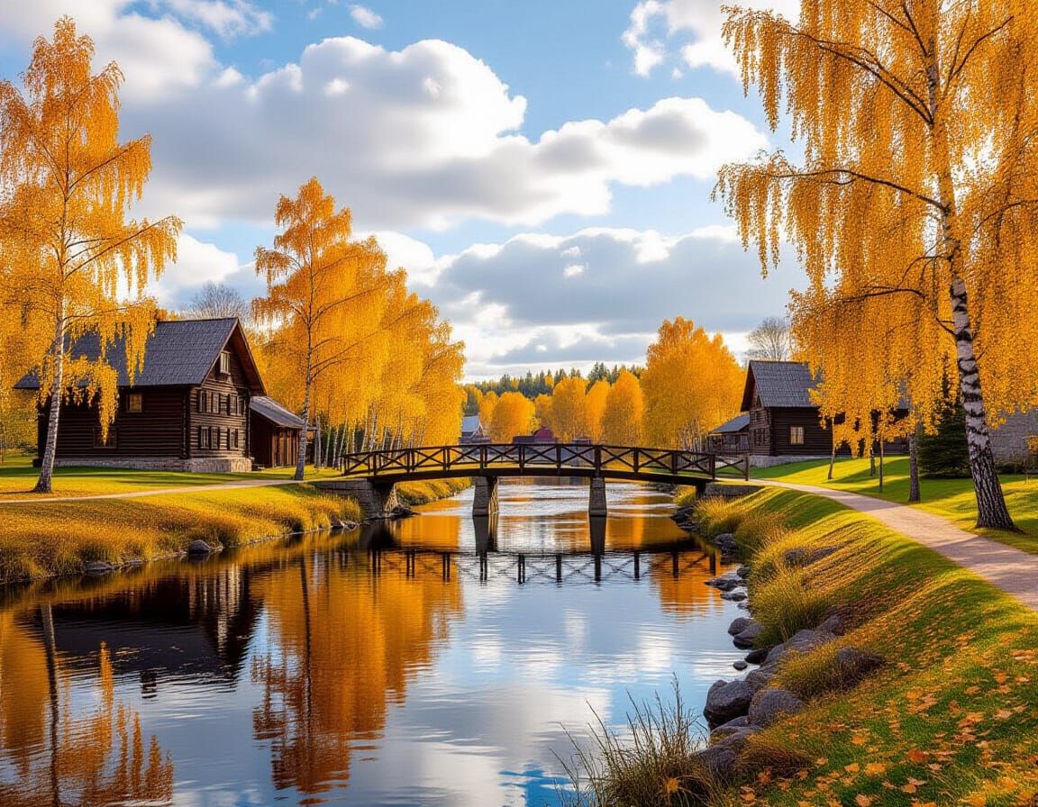 This image shows a tranquil autumn village by a river, with colorful maple and birch trees. A wooden bridge crosses the water, under a sky with painterly clouds. Rendered with a soft, atmospheric effect.