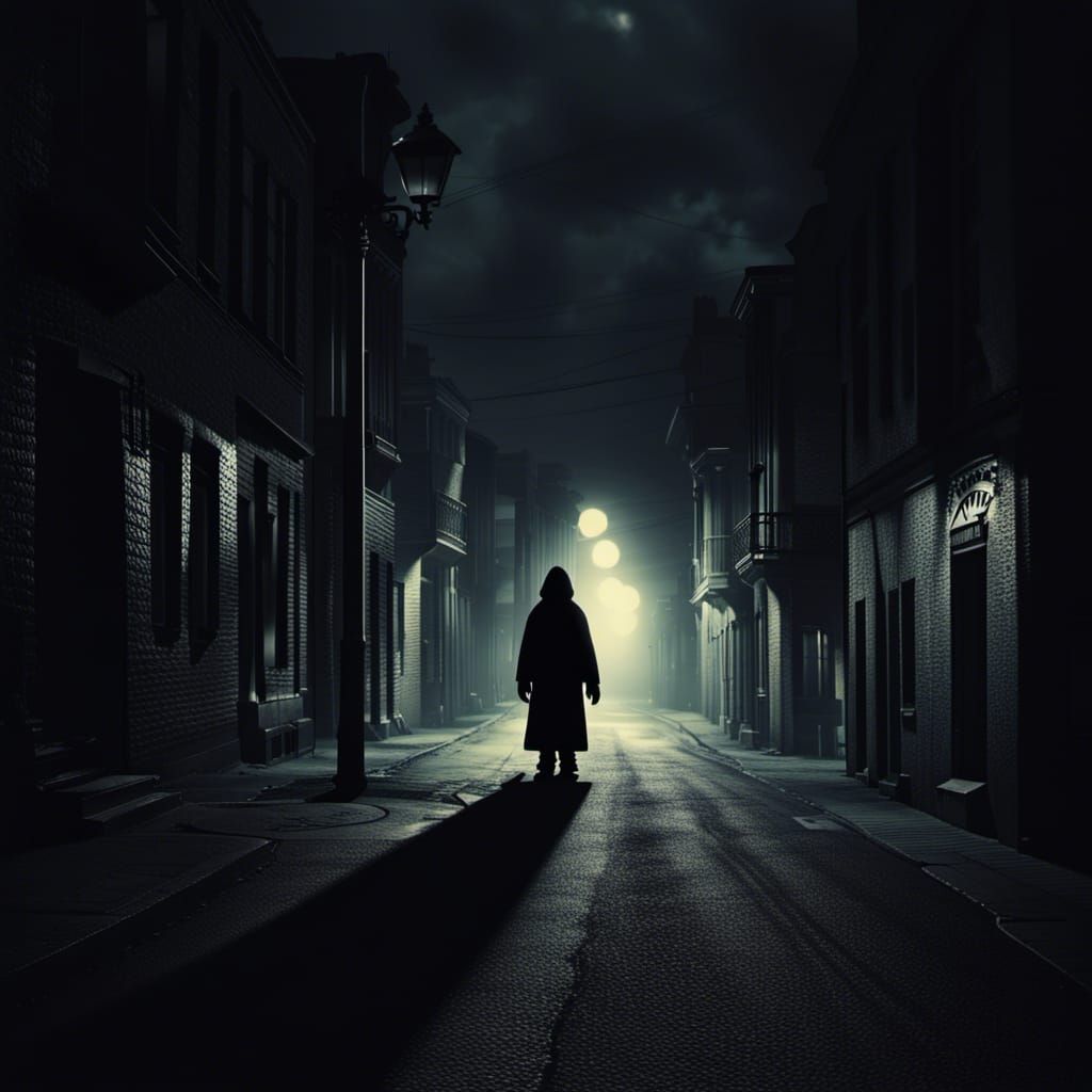 This image depicts a shadowy, ominous humanoid figure lurking in a small city at night. Street lights cast an eerie glow on the scene, creating a scary atmosphere.