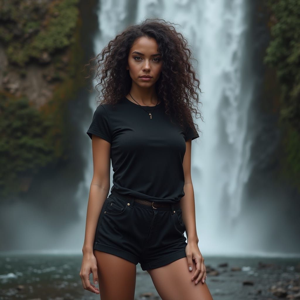 This image shows a confident Russian woman with curly hair posing near a waterfall. The figure is wearing a tight black tee and circular shorts, rendered with ultra-realistic skin details in cinematic style.
