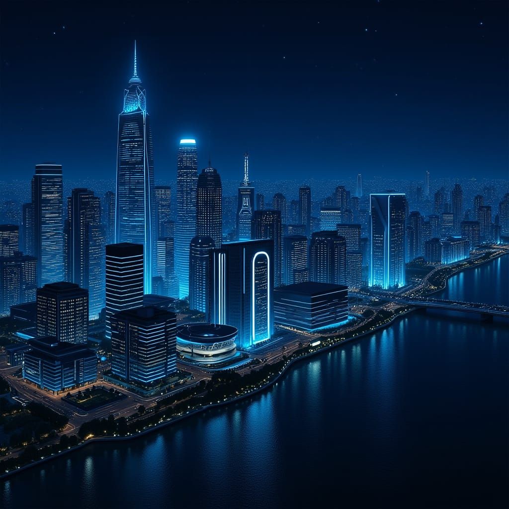 This image shows a futuristic cityscape at night from an aerial view. Neon lights illuminate advanced architecture, reflecting off tranquil waters in a digital illustration.