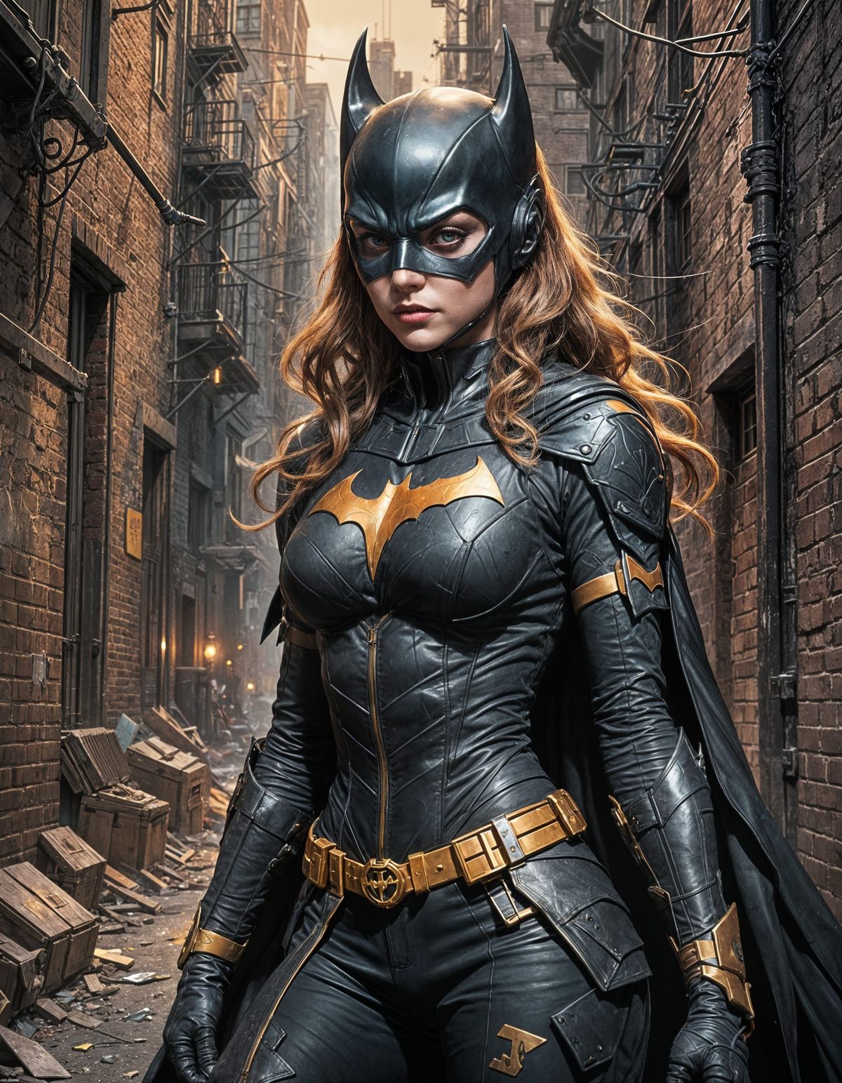A dark, gritty image of a disheveled Batgirl in a Gotham alleyway. The portrait features dynamic lighting, intricate detail, and a vibrant color palette.