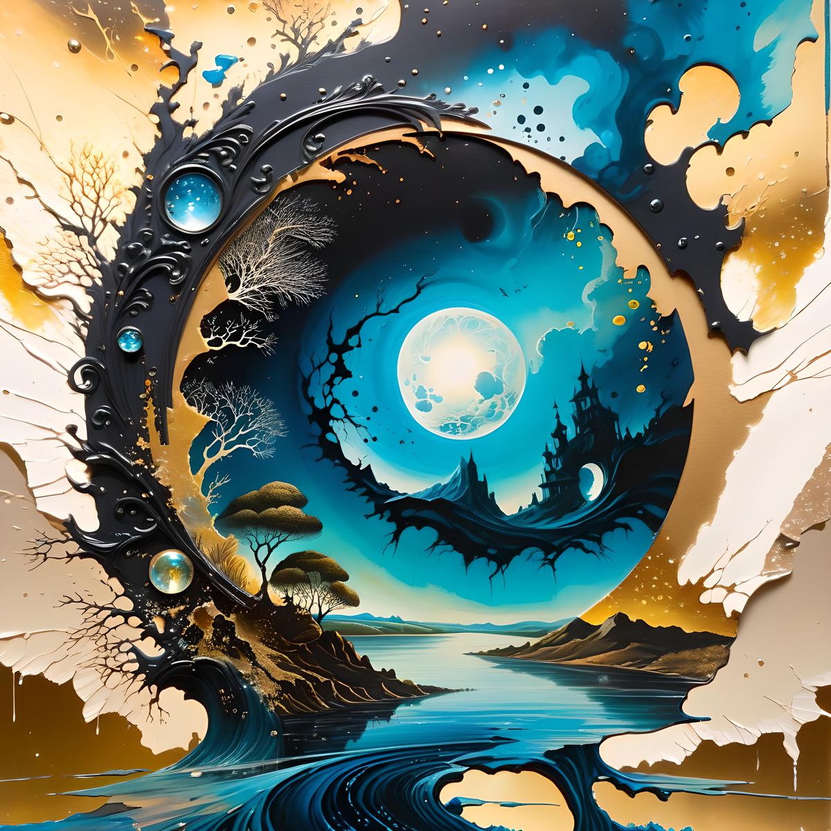 A surreal double exposure artwork depicting a light, natural world colliding with a dark, technological one to form a portal. This oil painting is reminiscent of Rococo masterpieces.