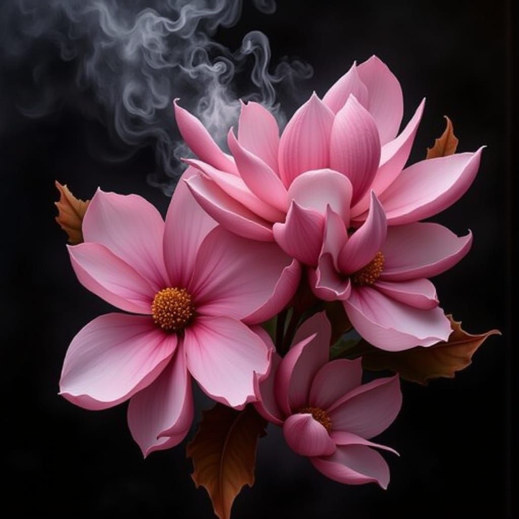 A hyper-realistic oil painting showing pink magnolia flowers against a dark backdrop. The image features a smoky haze and is rendered with meticulous attention to detail.