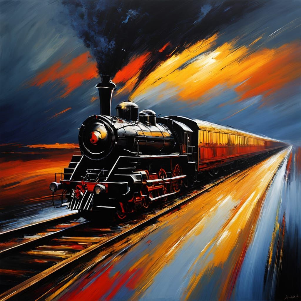 by Josh Adamski, long train running, Tachisme dynamic brushwork, violent thunderstorm, rough strokes, Debra Hurd
