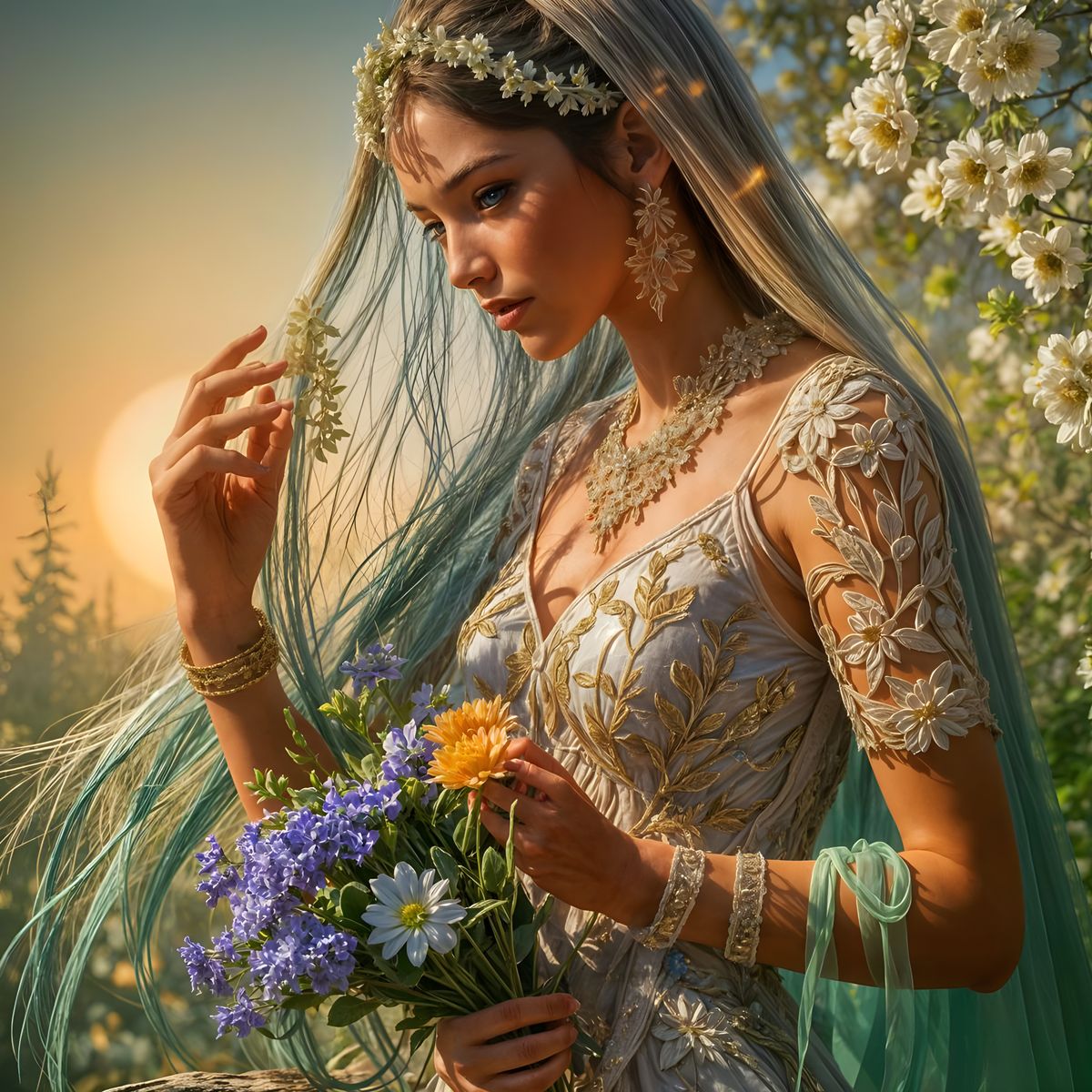 A surreal, dreamlike portrait of a beautiful woman with half her face illuminated by the sun, showcasing shimmering hair and ethereal lighting. Features intricate detail and high resolution.