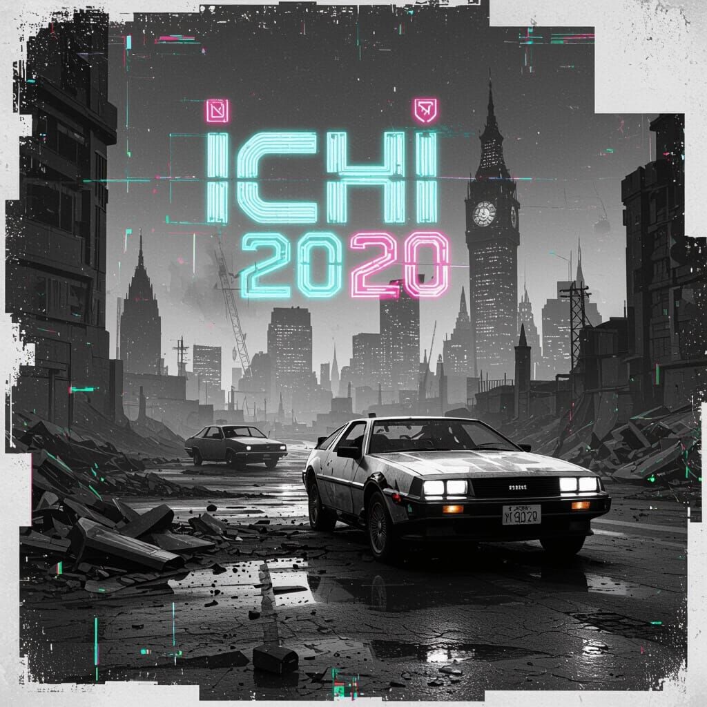 A faded, cyberpunk-style vision of a dark, dystopian London. This image depicts a deserted, crumbled landscape with a distant wrecked vehicle, rendered with a vintage, glitchy aesthetic.