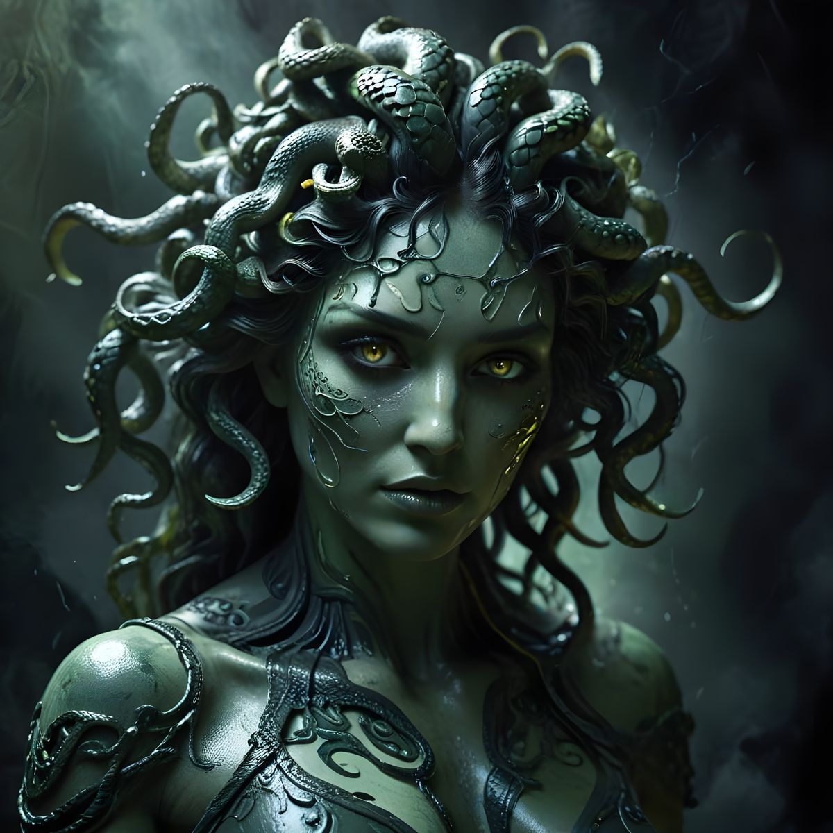 A captivating image of Medusa with glowing eyes and venomous snakes for hair. The artwork presents her haunting beauty with cracked, marble-like skin in a dark fantasy watercolor style.