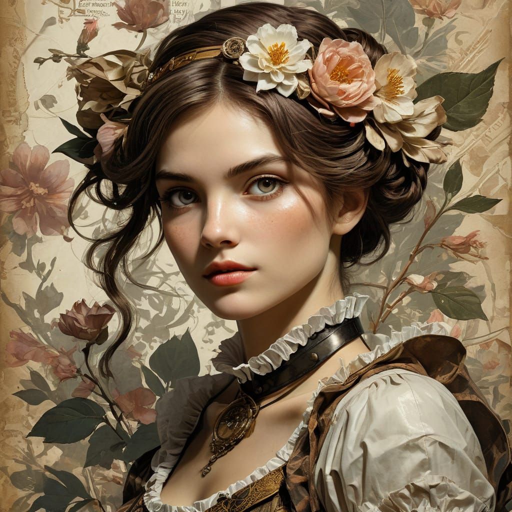 This image showcases a captivating Mesmer woman with flowers in her hair, set against a worn, crumpled paper background, reminiscent of classic comic book art with intricate Gothic details and soft, muted tones.
