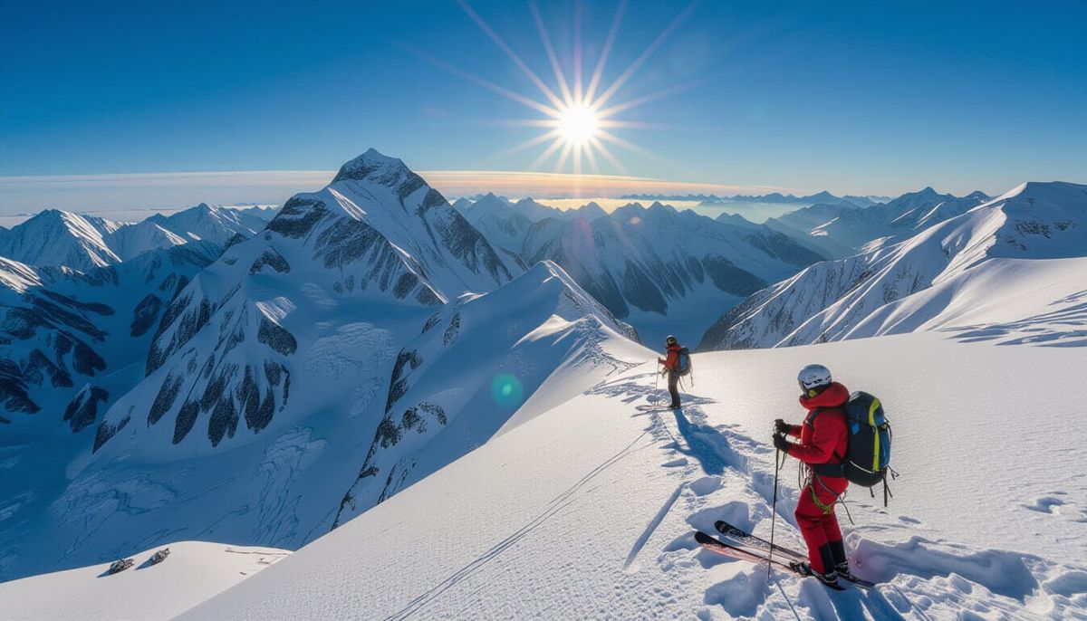 A sunny vista of two mountaineers ascending a glacier toward a snowy mountain peak, set against the backdrop of the Himalayas. The image is reminiscent of digital artwork.