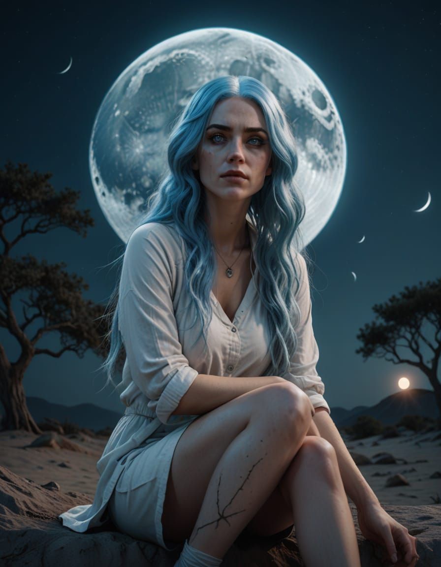 A hyperrealistic portrait of a woman with blue hair and eyes bathed in ethereal moonlight. The image features sharp focus and high detail, rendered in a photorealistic octane style.
