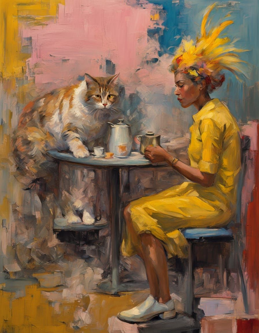 A medium shot of a giant tabby cat and a woman with vibrant pink hair and espresso pot attire. The scene features a banana-spitting machine and is rendered with abstract expressionism, impasto textures, and bold contrasts.