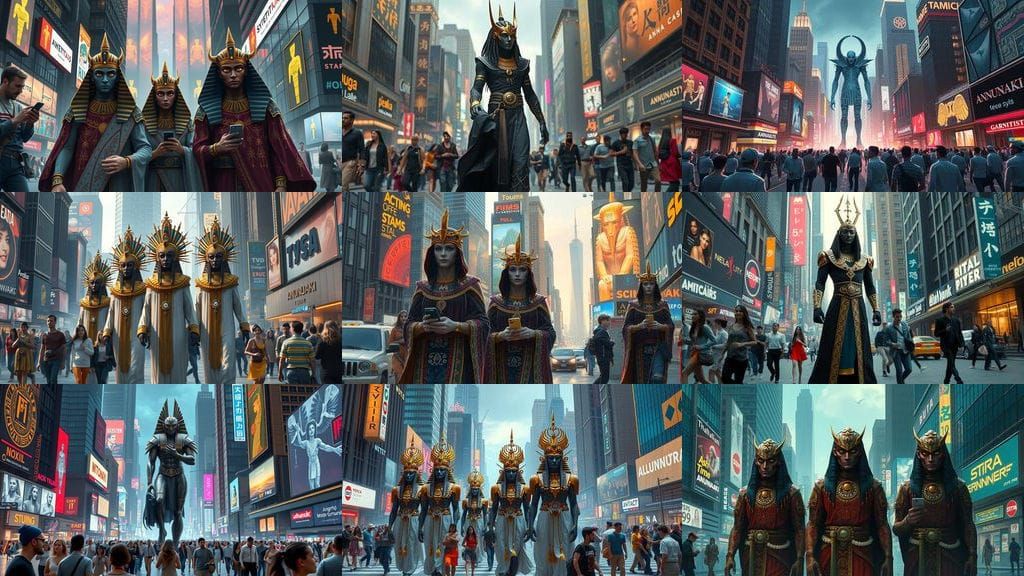 This image depicts a striking fusion of ancient and modern elements, showcasing the Annunaki in a contemporary urban setting.