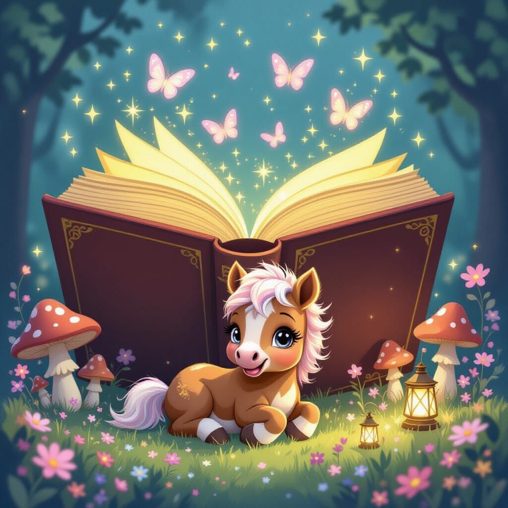 This image shows a charming fairytale scene with a foal resting near a large storybook. Butterflies and stars ascend from the book, illuminating the magical, pastel-colored landscape featuring glowing flora.