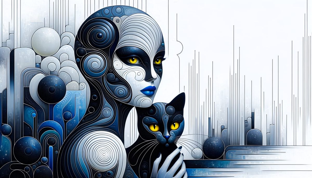 This image shows an abstract woman with yellow eyes and blue lipstick holding a black cat. The background features a dreamy, minimalist cityscape in glossy textures and vibrant colors.