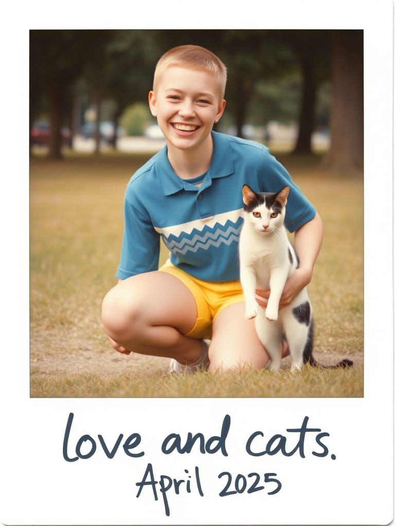 This nostalgic image captures a young woman with a buzzcut and her white cat with black spots in a park, surrounded by warm film grain and a classic Polaroid border.