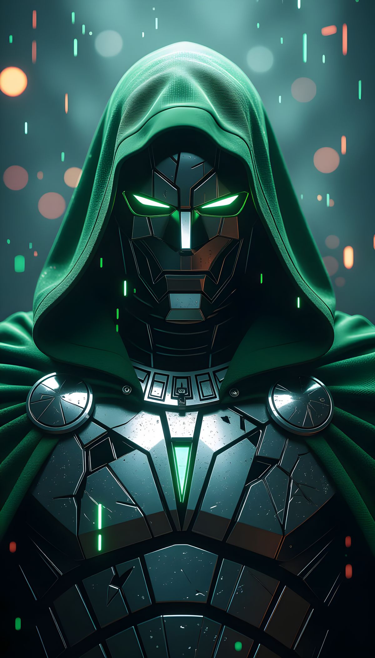 This image shows a hyper-realistic close-up of Doctor Doom. His steel mask features fractured pixels, neon distortions, and holographic static with emerald light pulsing through the metallic surface in a cyberpunk aesthetic.